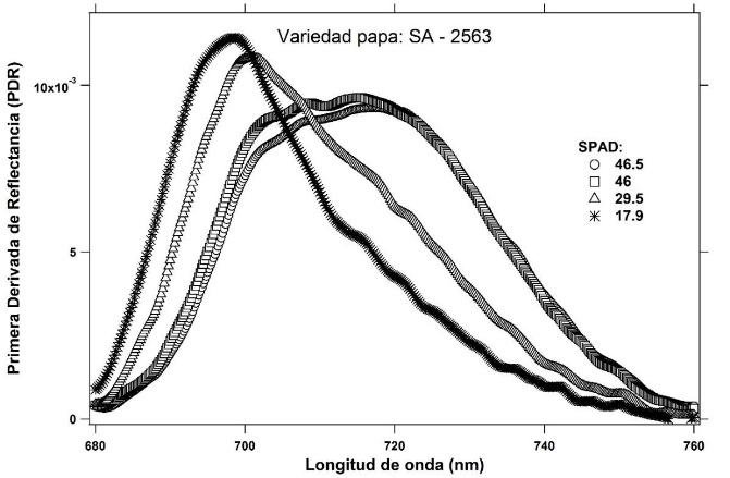 Para el cultivar de papa SA–2563 se obtuvieron cuatro señales de reflectancia visualmente diferenciadas (Figura 2) y correspondientes a las 4 fechas de evaluación. De manera simultánea se registró para cada fecha un promedio de lecturas de clorofila SPAD que disminuyó de 46.5 a 17.9 unidades SPAD, obteniéndose una amplitud de 28.6 (Figura 2). Para fines de validar el método, resulta ideal contar con un amplio rango de valores SPAD y simultáneamente diferentes espectros de reflectancia. Asimismo, para fines prácticos, se graficó la primera derivada de los espectros de reflectancia por longitud de onda desde 680 nm hasta 760 nm, debido a que dentro de dicho rango se presenta un pico máximo relativo para cada señal de reflectancia procesada (Figura 3).