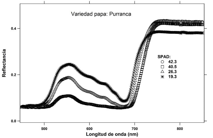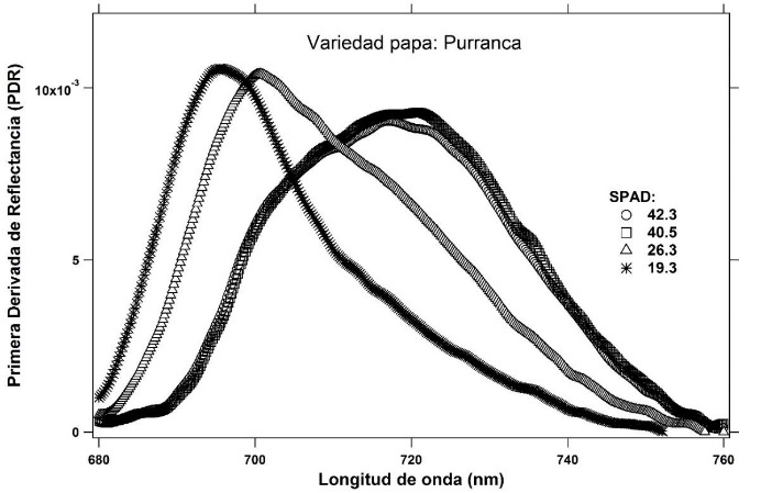 El cultivar de papa Purranca presenta tres señales de reflectancia visualmente diferenciados (Figura 6). Con respecto al promedio de lecturas de clorofila SPAD, los valores disminuyen de 42.3 a 19.3 con una amplitud de 23.0 unidades SPAD. En lo que respecta al gráfico de la primera derivada de los espectros de reflectancia, se presentan hasta tres picos centrados en diferentes longitudes de onda, como se observa en la Figura 7.