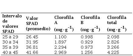 El contenido de clorofila total medidos en foliolos del cultivar Canchán presentaron una correlación lineal significativa R. = 0.98 y Pvalue = 0.0095 con las evaluaciones SPAD realizadas con el SPAD–502 en grupos clasificados en diferentes tonalidades de verde. Estos resultados representan una gran ventaja, ya que permitiría sustituir métodos tradicionales de cuantificación de clorofila en laboratorio por lecturas rápidas y no destructivas representadas en unidades SPAD. Los resultados de la cuantificación de clorofila A, B, y total, realizadas en laboratorio en intervalos de valores SPAD, se muestran en la Tabla 1.