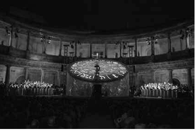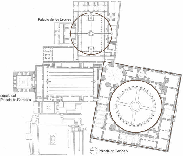 Desde un punto de vista estrictamente simbólico, al conjunto patrimonial se le otorgó en el pasado el papel de representar el Centro del Mundo, tanto por sus constructores cristianos como por sus predecesores árabes.17 Los palacios de Comares y Leones transcriben mediante sus arquitecturas la imagen islámica del Paraíso celestial, que en cada uno de ellos aparece codificado de diversa manera: la cúpula del Salón de Embajadores ofrece una visión cósmica y astral, frente al Patio de los Leones, donde se reproduce una versión más terrenal y sensitiva de aquel.18 A pesar de sus diferencias, ambas configuraciones espaciales obedecen a la voluntad de crear un centro primordial, que introduce en la arquitectura el ansia de perennidad y universalidad. Como si de un reflejo se tratase, el Palacio de Carlos V representa desde la concepción cristiana del mundo los mismos deseos de inmovilidad y universalidad, focalizados ahora en la figura del emperador que lo ordenó construir. Los códigos arquitectónicos mediante los cuales se materializa el deseo de expresar la autoridad imperial son los propios del clasicismo en su concepción neoplatónica: el círculo y el cuadrado que formalizan la planta del palacio remiten, respectivamente, al macrocosmos y al microcosmos.19