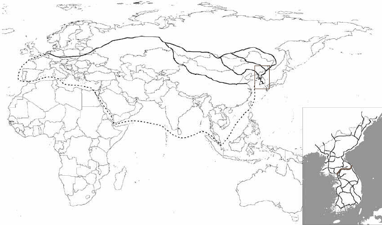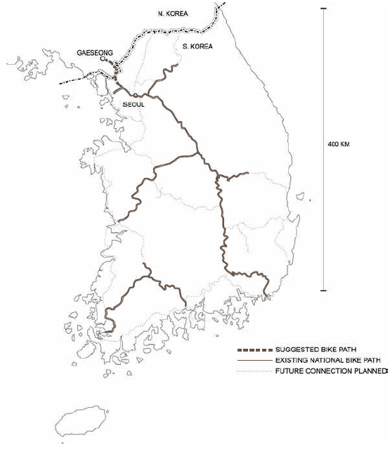 Busan, and it has a total length of 1757 km (1090 miles). Even though this national route does not reach the DMZ, recent events in Kangwon Province, specifically the 2015 Tour de DMZ, have shown great potential. Under the ‘Peace Parade’ motto, more than 2000 people have participated in cycling from Yeonchon to Chulwon along the DMZ on the east coast. The DMZ Cultural Center could integrate the bike infrastructure originating in Seoul along the Kyungui line toward Paju, Dorasan, to the DMZ Cultural Center, GIC, and even Gaeseong in North Korea (figs. 4 and 8).
