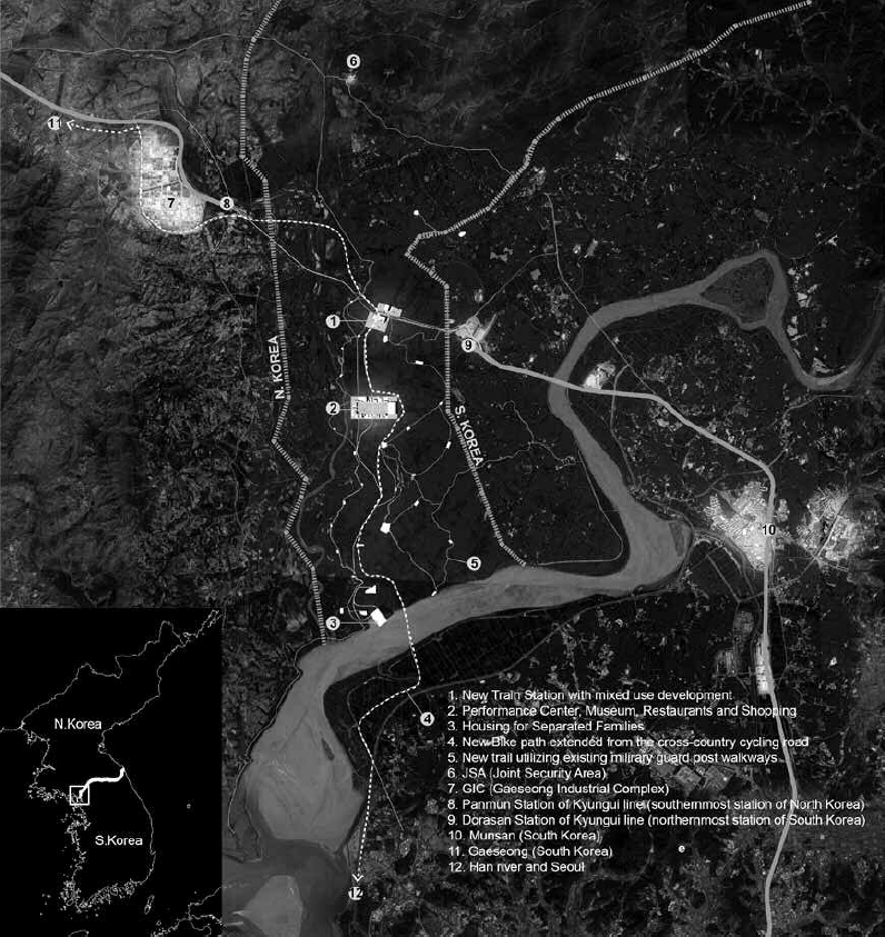The planning and design strategy of the DMZ Cultural center suggests that spaces can be seen as an event, not merely as a physical place. Unexpected encounters, cultural events, and entertainment could take place along the conflict infrastructure. The use of public space to enhance interactions and create opportunities for the reciprocal respect of plural cultures is an important prerequisite for the reconciliation process. Therefore, the Korean crisis is a great opportunity to address the role of architecture and planning in developing socio-cultural capital. Tragic history and the agony shared by both South and North Koreans can be transformed into a unique asset that shapes a peaceful, shared future.