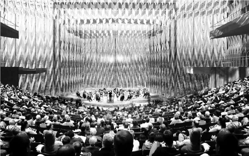 Another key feature of the DMZ Cultural Center, which would enhance the reconciliation effort, is a planned performance center. Those who visited Mt. Geumgang and worked for the GIC cited that meeting other Koreans was desirable. Over decades, the cultures of South and North Korea have grown apart; contemporary music and art in the South varies considerably from the traditional North Korean performance and circus ‘Arirang’ mass games. Cultural sharing fosters mutual understanding and is akin to making deposits into a collective memory, which then becomes the memorial, promoting participatory communications rather than didacticism in space. Images and sensations are the core architectural elements that establish a true memorial, informing the mechanism of memorialization. The architecture should capture the experience at the DMZ Cultural Center by the specific interaction between people in shared spaces. As an example, figure 7 shows the glass performance hall that provides a unique experience, emphasizing the DMZ and enhancing the views and perceptions of those it serves.