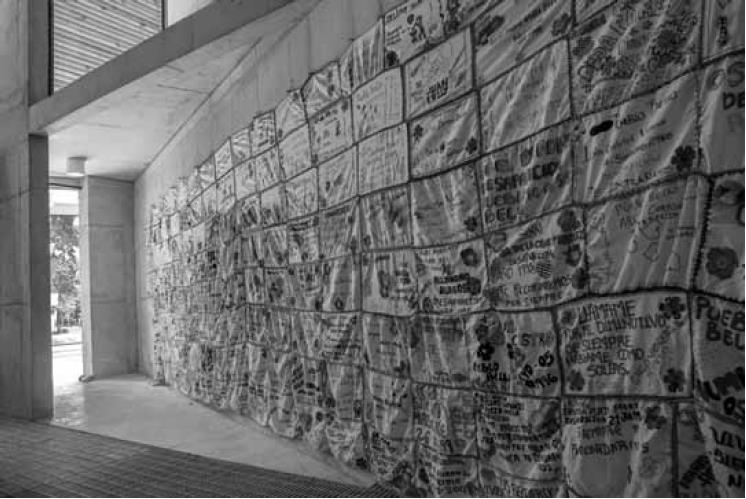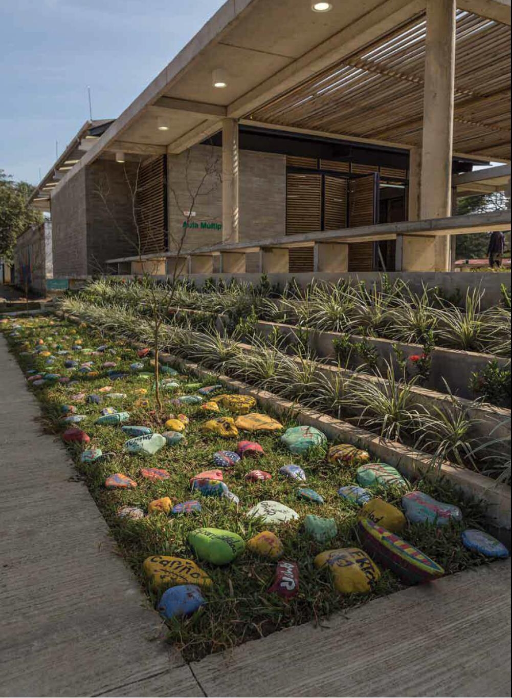 Para ingresar al volumen hermético de la Casa de la Memoria – que es el punto más alto del pueblo – es necesario desplazarse por una rampa acompañada por un muro de ocho metros de altura, el cual simboliza la irrupción de la violencia en el pueblo, transgrediendo en diagonal el volumen, estrechando y oscureciendo el recorrido. Al interior la luz es tenue y hacia las tres de la tarde de cada día, un lucernario emana luz rojiza que hace alusión al fuego que alguna vez consumió casas, objetos y personas. Al continuar el recorrido, el visitante puede reencontrarse con la luz y con un árbol más antiguo que el pueblo mismo, que pretende simbolizar el renacimiento de la comunidad. Se llega a un “aula abierta” que se conecta con la “Casa del futuro”, que es otro espacio que actúa como aula múltiple para la formación de las nuevas generaciones. De esta manera, el edificio recuerda un pasado cercano y doloroso, pero mediante recursos espaciales y sutiles, ofrece la posibilidad de trabajar por la construcción de un mejor futuro.