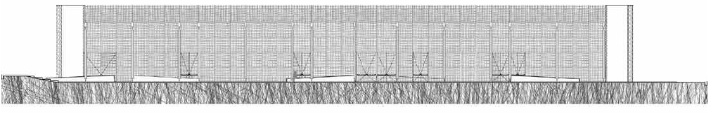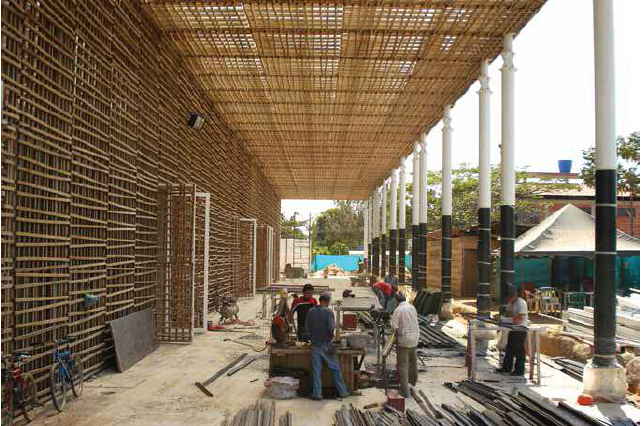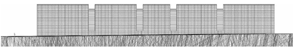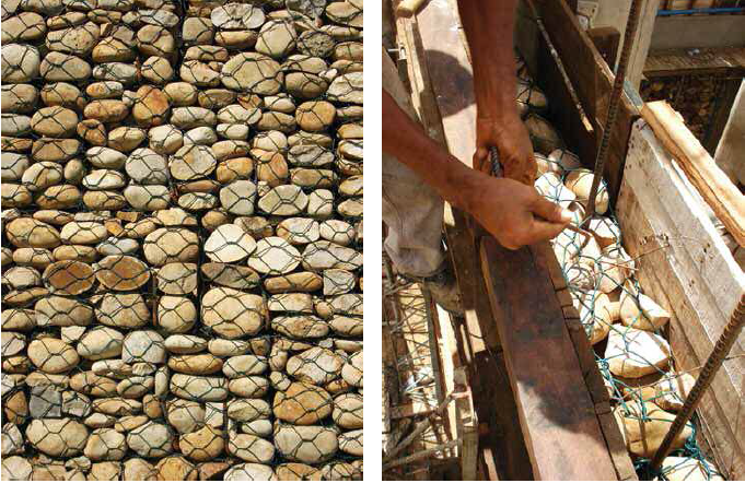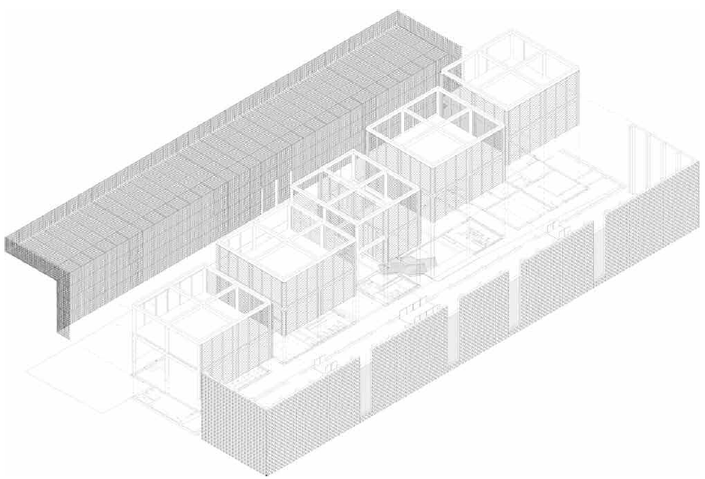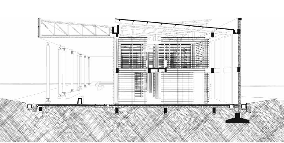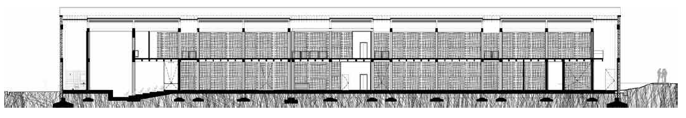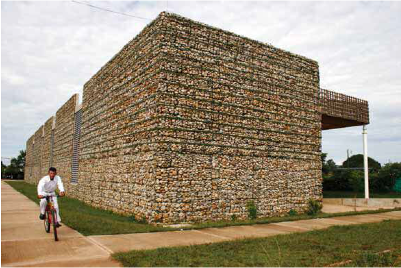La unidad material, que es una de las características más elocuentes del edificio, surge como la reinterpretación de unas técnicas e imágenes locales en un lenguaje contemporáneo. La reflexión de la envolvente es mediada por una gradación de tejidos, del más pesado al más liviano que sugiere una conexión con la tierra, pasando de la estereotomía del gavión, a la tectónica de la madera. Aquí se evidencia la aplicación de recursos del diseño pasivo al dar respuesta a un exigencia técnica de ventilación cruzada para favorecer el confort térmico del edificio, el cual carece de aire acondicionado.