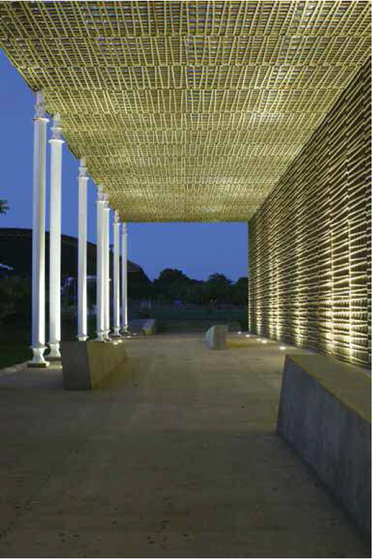 Finalmente, se destaca el espacio público que recrea la plaza cubierta en forma de logia, permitiendo alojar actividades colectivas en forma más permanente, a pesar de las condiciones del clima tropical extremo, ya que protege del sol de la tarde a la fachada occidental y constituye un espacio de encuentro que trasciende el programa mismo de la biblioteca.