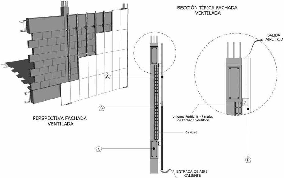 Para lograr las temperaturas mencionadas —sin ayuda de HVAC— es necesario el diseño y aplicación de tecnologías constructivas innovadoras. Una de estas es la denominada fachada ventilada. Está compuesta principalmente por dos pieles (una exterior y una interior) con una cavidad ventilada de aire localizada entre ellas. Los materiales de estas son en su mayoría el vidrio, el mármol y la cerámica. Como condición básica, la piel externa debe estar hecha de un material rígido que posea buenas condiciones térmicas de aislamiento. Los elementos del sistema están aferrados a una subestructura (generalmente hecha de perfiles de aluminio o acero) que a su vez está anclada a la estructura principal del edificio (fig. 3).14