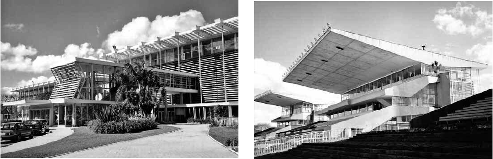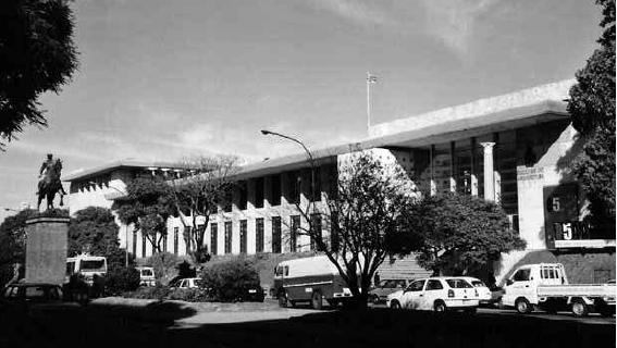 En el margen opuesto, jóvenes arquitectos como Luis García Pardo y Raúl Sichero Bouret daban los primeros pasos en dirección a una arquitectura moderna, cuando se cerraba la primera mitad de siglo XX. Profesionales como Román Fresnedo Siri realizaban obras en las que el acento académico inhibía la utilización de la sintaxis moderna, como demuestra la pauta clásica de la Facultad de Arquitectura de Montevideo: la solución conservadora elegida acomodó el edificio de forma contingente a la esquina, adoptando como generatriz un sector de circunferencia que originó un patio interior triangular (fig. 1). La obra expone los orígenes académicos visibles del autor, características de la Escuela Uruguaya; una tendencia que se revirtió en la segunda mitad de la década de cuarenta, como demuestra su proyecto para el Jockey Club de Porto Alegre, de 1951.