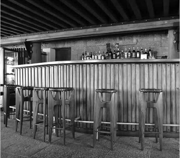 La riqueza de detalles se acentuaba en el interior del edificio. El restaurante presentó un biombo articulado a la entrada de los sanitarios, formado por láminas verticales paralelas. La barra curva del bar, de aspecto rústico, también fue confeccionada en madera, así como el resto del mobiliario proyectado por el arquitecto (fig. 11). La sofisticación en los detalles llegó a su punto más relevante en el diseño de las ménsulas que sustentan el entresuelo, fundidas en metal y fijas sobre los pilares de sección circular acanalada, en hormigón a la vista y con textura (fig. 12). La pared de piedra del ala perpendicular adentró el restaurante, reforzando la lectura del volumen estereotómico10 en contraste con la carpintería de los cerramientos transparentes. En ella, piedras horizontales delgadas sobresalen algunos centímetros respecto a la pared y producen una textura. El zoning de funciones en la planta baja, a través de diferentes pisos nivelados, es otro elegante detalle que merece mención.