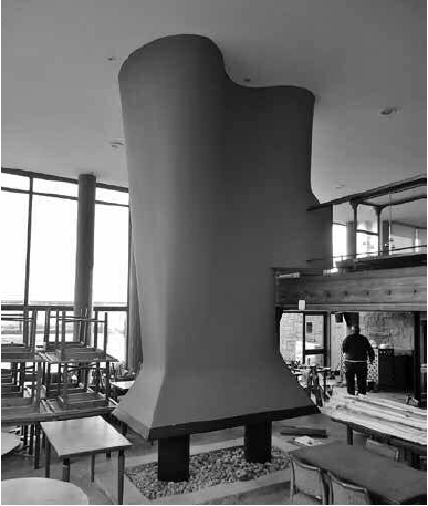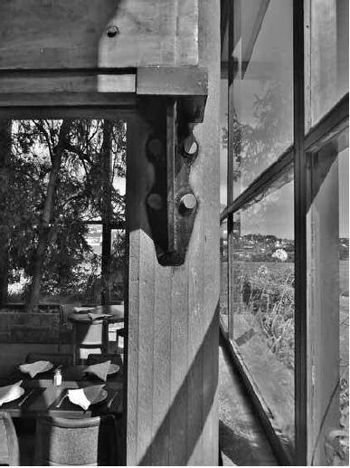 La cortina de vidrio de doble altura del restaurante fue protegida originalmente por un brise vertical de planchas de madera espaciadas, como lo comprueba la foto del libro de Henry Russell Hitchcock.8 Producía un grafismo delicado sobre la fachada, eliminado posteriormente. La parte lateral desprotegida expone la silueta de un par de “hogares” de la chimenea sobrepuestos (uno de ellos en el entresuelo), cuya forma resultante recuerda el dibujo de Miró o los objects trouvés lecorbusianos: una mención a la influencia surrealista, la cual él afirmaba haber sentido intensamente en la pintura, desde Barcelona, y que fue “trasladando para la arquitectura” (fig. 9). Al recordar su paso por el atelier de Le Corbusier, Bonet cuenta que él le encargó un proyecto donde incorporó la libertad creadora propia del movimiento surrealista a la arquitectura racionalista.9 En la parte posterior del parador, el perímetro se recorta, pues surge un ala perpendicular que abriga los servicios. El tratamiento del anexo exploraba el contraste del revestimiento de piedra con paneles de madera vertical (fig. 10).