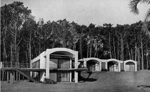 En 1945, Bonet proyectaba la casa del poeta Rafael Alberti en Punta del Este. Rústica, La Gallarda hacía una mención explícita al modelo de Errázuris, con sus tejados “mariposa” (fig. 4). En el mismo año, el arquitecto se trasladaba a Uruguay durante una temporada. Contratado por la familia Lussich (Lukšić, castellanizado), de origen croata, proyectó y ejecutó la parcelación de un gran terreno en la playa de Portezuelo, junto a Punta Ballena, en el bosque artificial conocido como Arboretum Lussich.6 La oportunidad constituyó un laboratorio de experimentos formales y constructivos para el arquitecto. Se fusionaban en el conjunto la antinomia racionalista y sensual de Le Corbusier con las referencias propias de Aalto, perceptibles en el parador La Solana del Mar (1946), que actuó como ancla del emprendimiento: pequeño hotel con restaurante y night club en la playa.