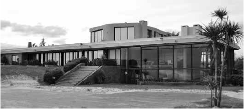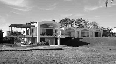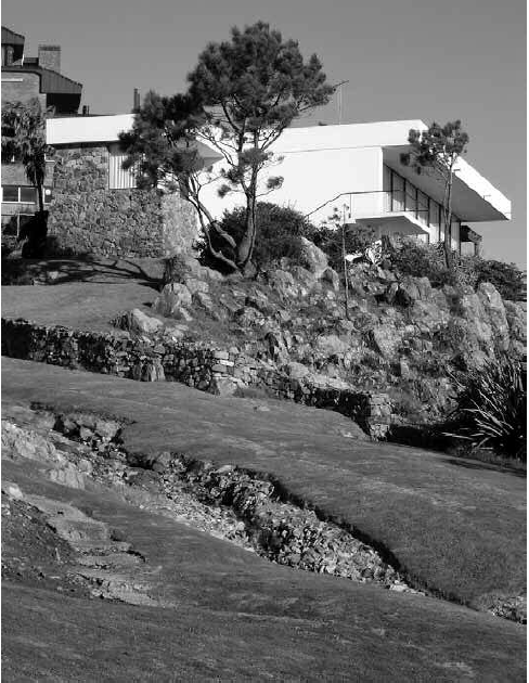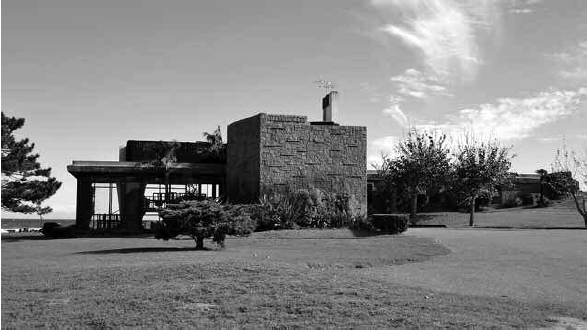 Además de estas dos obras referenciales para la arquitectura del Cono Sur, Bonet realizó otras tres casas en La Solana. En la menor de ellas, la Quatrecasas (1947), se destaca la horizontalidad transmitida por la delgada cubierta que define el volumen. Más amplia, la casa Booth (1947-1948) también presenta una horizontalidad acentuada. El partido adoptado, en dos cuerpos paralelos conectados por una galería, es similar a un esquema frecuente de la Escola Carioca, que remite igualmente a la solución binuclear de las casas de Marcel Breuer. La tercera de ellas, la casa La Rinconada, es la que merece mayor destaque, además de ser la casa del arquitecto. La solución utilizada fue un prisma horizontal en contraste con la topografía del paisaje agreste, en la pendiente abrupta y rocosa de la Punta Ballena (fig. 15). La fachada de paños de vidrio en toda su extensión trae para adentro de la amplia sala la vista deslumbrante, con la playa abajo y la extensa línea del horizonte sobre el mar. Aquí la fachada de vidrio remite a ejemplos como la Casa Tugendhat, de Mies; sin embargo, las gárgolas del entablamiento, originalmente más bajo, se identifican con la dramaticidad propia de Le Corbusier. El fondo presenta paredes de piedra bruta, material que se extiende por la base elevada y contrasta con la síntesis de planos blancos de la mampostería. 12