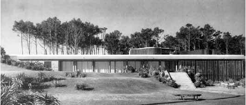 La inspiración de Bonet en la arquitectura moderna brasileña es plausible, dentro de la tendencia que se manifiesta en Uruguay en los años cincuenta.15 Sin embargo, las grandes superficies transparentes del Hipódromo seguramente no vienen de aquella; parecen procedentes de otras latitudes. También es factible su deuda con la obra de Bonet en punta Ballena, en aquel conjunto de proyectos modernos ejemplarmente resueltos y construidos. La libertad formal de ellos, que asociaron formas curvas, transparencias generosas y la utilización de materiales y técnicas inéditas en la región —como las cortinas de vidrio del restaurante, los revestimientos exteriores en madera, las cubiertas con bóvedas de arco rebajado y los techos planos—, era una experiencia que se estaba poniendo en práctica a pocos metros de la casa de veraneo de Fresnedo Siri, localizada en los altos de La Ballena.16 Ecléctico en la mejor acepción de la palabra, el arquitecto transitó virtuosamente a través de diferentes sintaxis e influencias arquitectónicas, con una destreza posible de ser atribuida a la sólida formación académica que tenía.