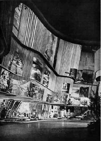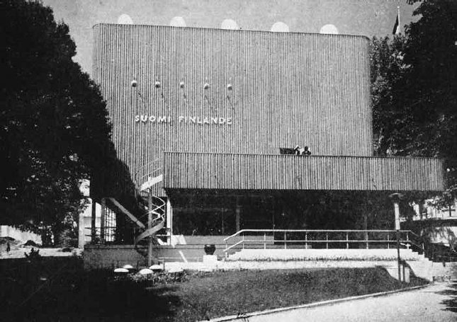Para revestir aquella “forma libre” característica de Aalto, Bonet adoptó la misma solución: utilizó láminas verticales de madera, material que se extendió generosamente sobre otras superficies exteriores, piso y en la estructura del entresuelo y en parte de las divisiones internas. Aalto había utilizado la madera de ese modo en su casa en Helsinki, proyectada en 1934. Al año siguiente vencía el concurso del Pabellón Finlandés para la Exposición de París de 1937, en el cual llevó la solución al extremo, al revestir todo el edificio efímero de esa forma (fig. 7). En el pabellón de Finlandia para la Exposición Universal de NuevaYork (1939), proyectado en 1937, el espacio interior fue elevado al protagonismo, por medio de la utilización de las curvas inclinadas en las paredes, revestidas con láminas de madera verticales (fig. 8); y en la Villa Mairea, proyectada en ese mismo año, la utilización de la madera parece haber alcanzado su apogeo: las formas curvas de los dos aleros, el volumen cilíndrico sobre el acceso y los entablamientos del sector social, todo fue igualmente solucionado a través del revestimiento con listones verticales.7