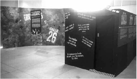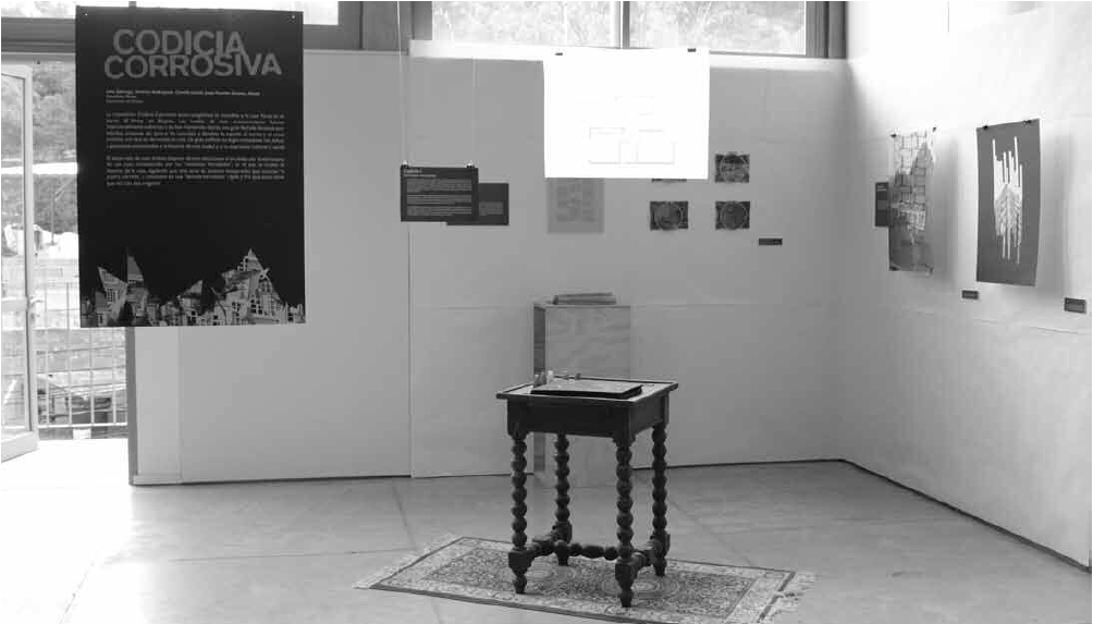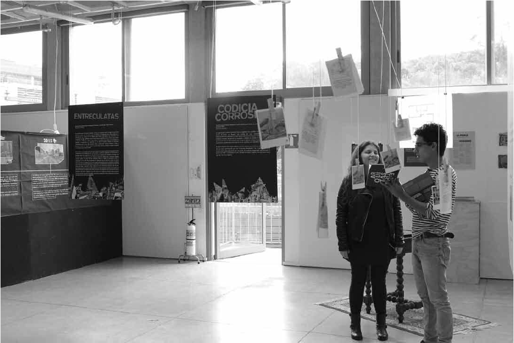 Siete de estos textos y sus imágenes, fueron el insumo con el cual los estudiantes del curso Estudio 6: Diseño para exposiciones del Departamento de Diseño, iniciaron su proyecto final de semestre. Arquitástrofe, Espacios fallidos en Bogotá, es su interpretación de estos contenidos para transformarlos en una narrativa expositiva, que ofrece a los visitantes a la muestra una experiencia desde la mirada del diseño frente a estas problemáticas urbanas. Los ámbitos que componen la exposición giran en torno a conflictos relacionados con el uso, la seguridad, la movilidad, la representatividad y el medio ambiente. Problemas que derivan en inconformidad, sensación de inseguridad y un limitado sentido de pertenencia.
