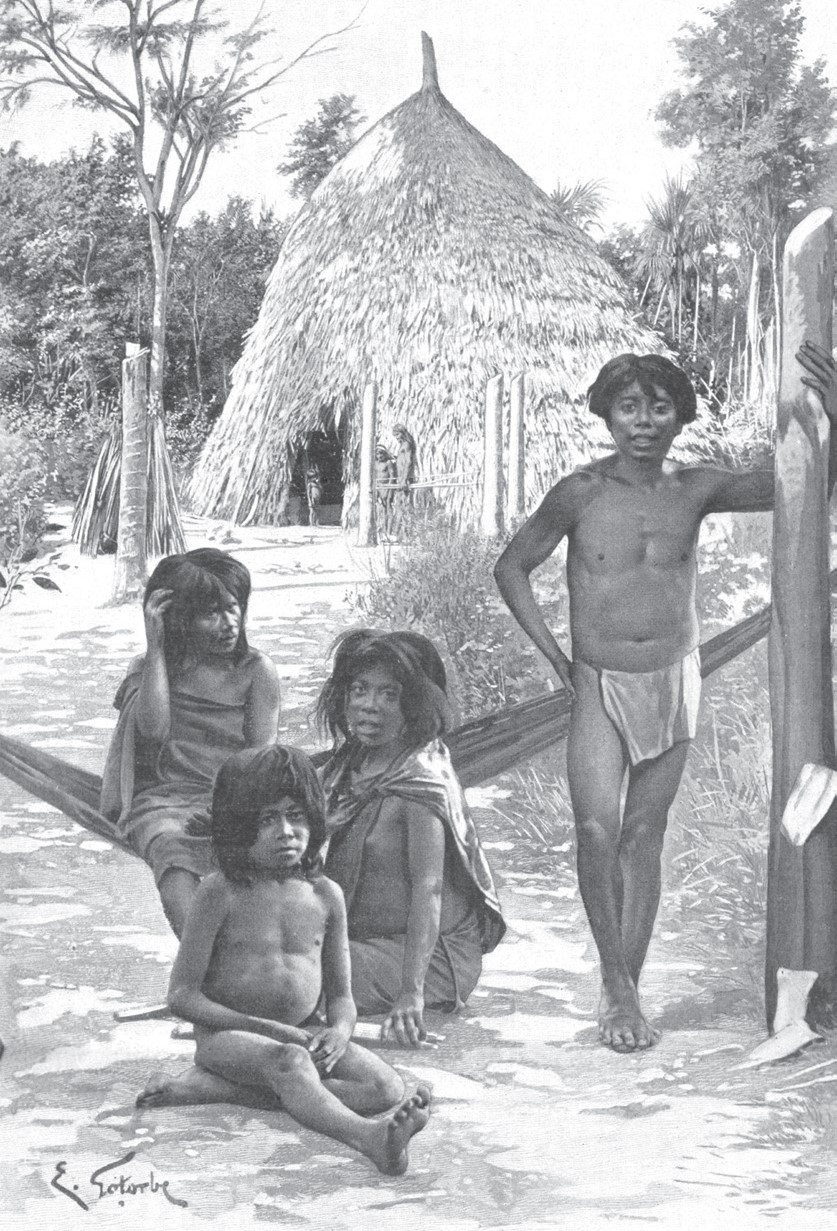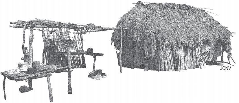 La casa no es un tema sobresaliente en la literatura consagrada a los ette, situación que contrasta con lo reportado entre otros pueblos indígenas cercanos en términos geográficos y lingüísticos.[22] Las razones que explican este vacío remiten tanto a la austeridad general que caracteriza a la cultura del grupo como a los prejuicios de las investigaciones tradicionales, centradas en el tema. Por un lado, las viviendas construidas por los ette pertenecen al ámbito de lo profano y raramente figuran en el discurso mítico y la acción ritual, lo que dificulta la restitución de su dimensión simbólica. Por otro, los patrones de construcción han sufrido transformaciones relevantes, debido a la influencia foránea durante el último siglo, lo que frecuentemente ha desestimulado el examen de las prácticas arquitectónicas nativas.