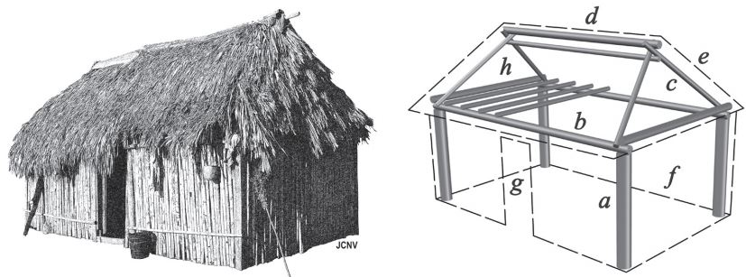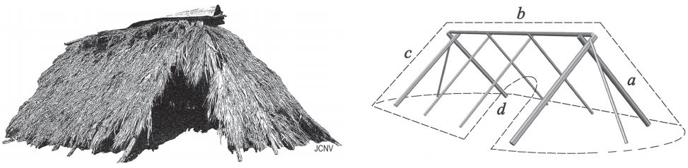 La primera habitación levantada suele ser un cobertizo jukka, lo que no es de extrañar dada su simplicidad (fig. 4). Dentro del ciclo arquitectónico, la edificación se asocia a un estado de inmadurez. El cobertizo es una forma habitacional elemental en la que están presentes todos los principios definitorios de la arquitectura indígena sin estar desarrollados plenamente por ejemplo, una base alargada, una cubierta hermética, una sola puerta de entrada y un armazón alineado con el recorrido del sol. Por esta razón, se concibe como una suerte de feto, compuesto únicamente por un espinazo del cual surgen unas incipientes extremidades, respectivamente encarnados por el caballete del techo y los postes que lo sostienen. Coincidiendo con todos estos rasgos, sus ocupantes conforman un grupo social naciente, como puede ser una pareja de muchachos deseosos de independizarse o, bien, una familia recién llegada a un lugar de residencia.