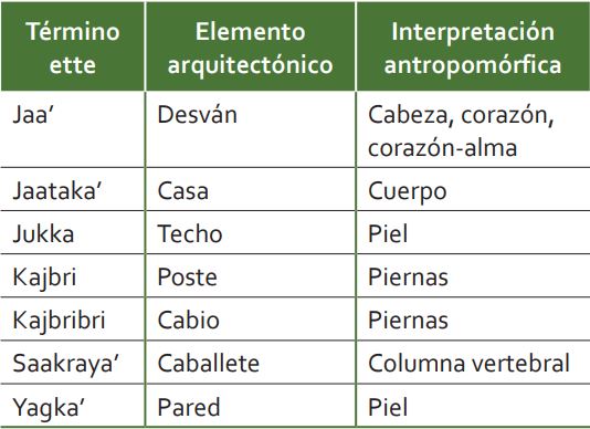 En cualquier caso, ni la profanidad de la casa ette, ni su inevitable sujeción a las vicisitudes históricas, deben tomarse como un signo de simplicidad. La ausencia de mitos y ritos en torno a las viviendas, así como su actual similitud con aquellas construidas por la población campesina, se encuentran compensadas por una arquitectura conceptual rica y profunda. Las edificaciones hechas por los indígenas son el resultado de un saber tan técnico como simbólico, ejemplificado en la equiparación de la vivienda con una persona, así como en el establecimiento de una serie de correspondencias entre elementos arquitectónicos y partes del cuerpo. Un examen más calmado, sin duda, también habría sacado a flote otras dimensiones tan interesantes como la expuesta.