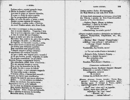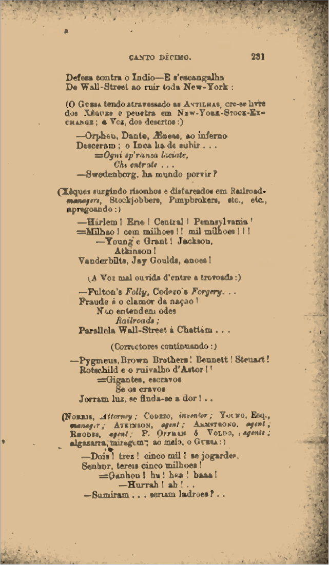 Most of Sousândrade’s poem is written in decasyllables, hardly an innovation—even if one takes into account the occasional 4, 6 and 7 syllablebased verses that appear in a handful of pages. When the guesa arrives on Wall Street, though, the poetic form suddenly changes into a surprising arrangement that reflects the theme, i.e., the chaos of Wall Street in 1873; this part of O Guesa became known as the “Wall Street Inferno” (a title given by the Campos brothers in their studies of Sousândrade).
