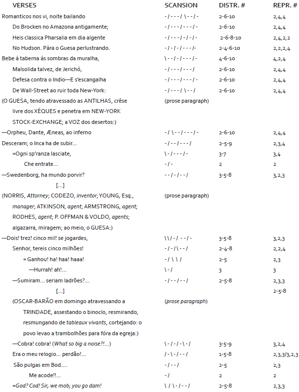 Below is a proposed scansion of the transition from decasyllables to infernisms in O Guesa, as well as two more infernistic stanzas (the 5th and 28th, counting from the arrival on Wall Street; note the caesura symbols are omitted).