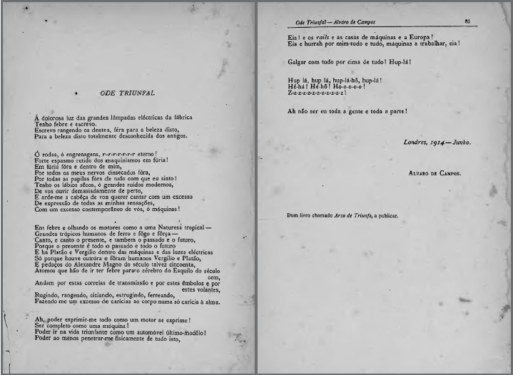Verde was not the only herald of modernism and urban-poetics. Fernando Pessoa created a heteronym inspired by Verde using the name Alberto Caeiro; Caeiro, in turn, had Álvaro de Campos— another fictitious Pessoan poet—as his disciple. Campos’s first shocking poem—too futuristic to be taken as sane and too ironic to be taken as merely futuristic—was titled “Ode Triunfal.” When published in Orpheu I, the ode, though written in Lisbon, was dated “London, 1914— June”—one month before World War I broke out. Yet, Pessoa never visited London (Campos, the heteronym, had traveled extensively in Pessoa’s fiction, like a Marco Polo of modernism).
