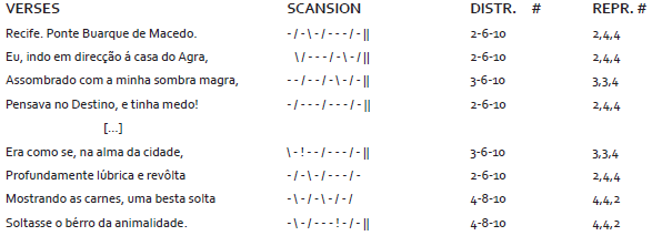 As Anjos proceeds with his poetic report, mixing exterior (city) and interior (poet), remarkable evaluations of the city are made: for example, in the sixth stanza, which is scanned below, after the first: