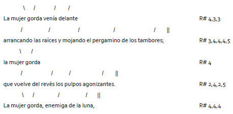 A scansion of the first page of Verde’s poem generates a rhythmic blueprint: unstressed syllables are marked with a hyphen (-); stressed syllables with primary (/), secondary (\), or secondary-elevated- to-primary (!) accents; and long pauses with the caesura symbol (ll). Moreover, the Distributive Number (of syllables stressed with primary accents) and the Representative Number (of the amount of syllables in each foot) are presented for each verse.5