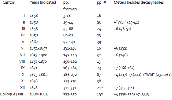 Born in Brazil in 1833, Sousândrade lived in NYC from 1871 to 1879. His 350-page O Guesa was first published in NYC (1877); a revised edition was published in London (between 1884 and 1902). 16 As shown in the table below, the British edition displays years (which I interpret to be years of composition) as subtitles to each of the thirteen Cantos of O Guesa. Cantos VII, XII and XIII are incomplete. 17 The table also presents the page count for each Canto, and any meters employed besides the predominant decasyllable (e.g. +6 means that the Canto in question also contains hexasyllables on the pages in parentheses; “WSI” stands for “Wall Street Inferno,” as shall be explained).