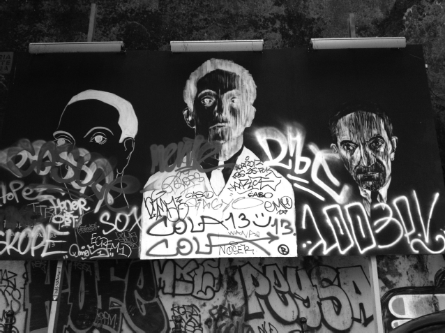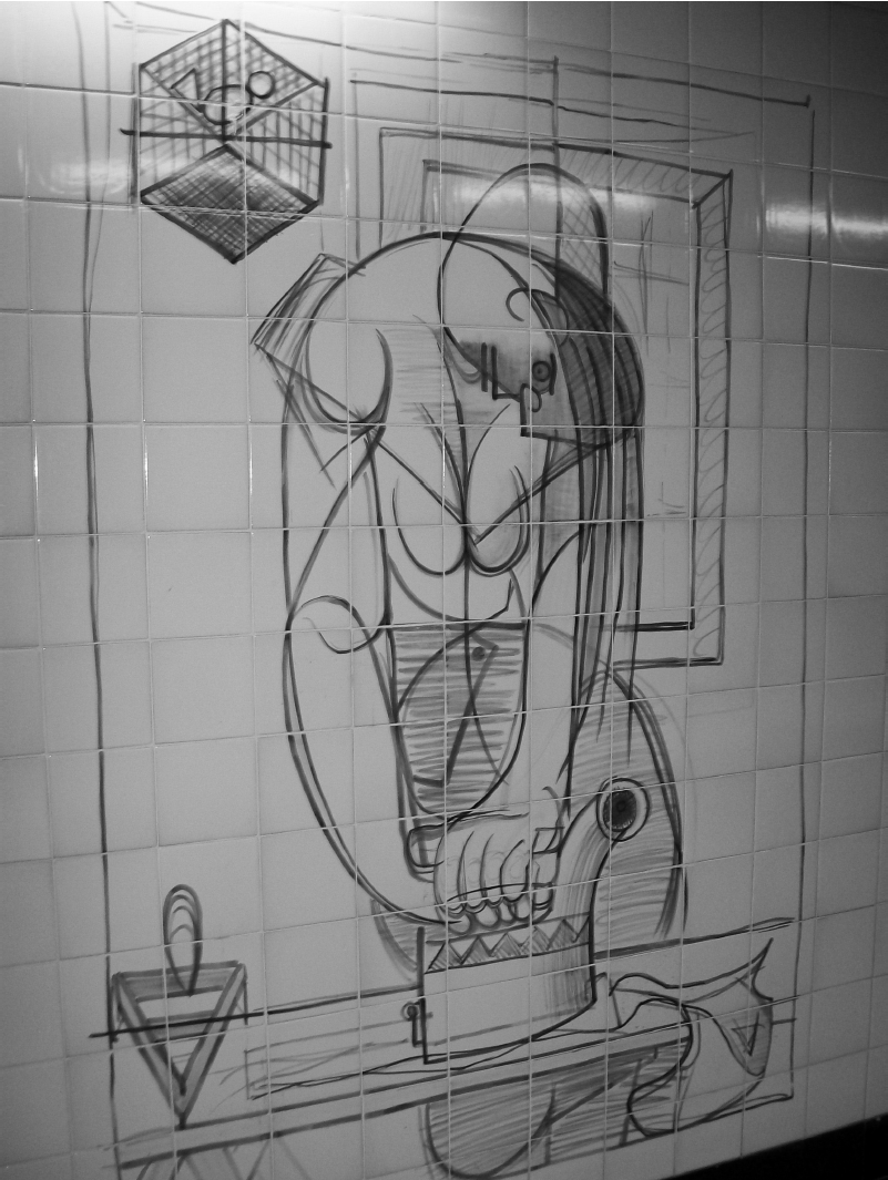 El valor simbólico de la imagen pública de José de Almada Negreiros, declarado en 1969 como un artista libre a pesar de las muchas demandas de una dictadura que llegaba a su fin, nos ayuda a comprender ahora por qué su figura sigue siendo evocada en la capital a principios del siglo XXI. En las últimas décadas, así como el grafiti anónimo que aparece de vez en cuando en las paredes de la ciudad, muchos artistas han optado por hacer referencia a Almada o citar su obra literaria o plástica. Un panel de azulejos concebido por Leonel Moura, en 1993, sirve como una especie de cartel de bienvenida a la ciudad, visible para los que entran por la autopista del sur (fig. 10). Lo encontramos también en el metro de Lisboa, en las estaciones recién terminadas de Saldanha (fig. 11a y 11b) y en el aeropuerto. Más recientemente aún, Almada fue objeto de una exposición de grafiti inaugurada en la Calçada da Glória, en la primavera de 2013 (fig. 12). Como se desprende de estos fragmentos, copias y ecos de la obra almadiana, es evidente que la figura de José de Almada Negreiros sigue muy vinculada a la ciudad donde él vivió y trabajó, y ahí toma una fuerza vital, simbólica y comunicativa.