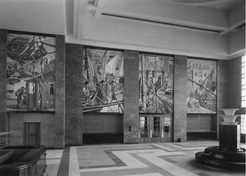 En esta revelación de facetas y perspectivas inesperadas de los paisajes familiares, encontramos la receta utilizada por Almada con vista a crear una obra de arte pública con elevado valor comunicativo. Los mejores ejemplos de esta tendencia se encuentran, sin duda, en los paneles que decoran la Estación Marítima de la Roca del Conde de Óbidos, que representan la culminación de un proceso iniciado unos años antes, en el trabajo de decoración de la sala de espera de la estación marítima de Alcántara (fig. 5). En ese espacio, Almada imaginó una escena ribereña de Lisboa de manera naturalista. En el conjunto de paneles titulado Quien no ha visto a Lisboa, no ha visto cosa buena(fig. 6), el artista capta algunas de las actividades típicas del puerto de Lisboa, representadas con el trabajo de tres mujeres descargando carbón y otras tres vendiendo pescado. Como contrapunto a esta actividad, la ciudad en el fondo se ve completamente vacía de personajes o movimientos, a la excepción de “un tranvía que pasa, como un fantasma silencioso”.7 Estamos entonces frente a una ciudad que espera a alguien o a algún acontecimiento. Aunque sea imposible determinar las razones exactas de la eliminación de las demás figuras de la escena (que estaban presentes, por cierto, en los estudios preliminares), el artista quiso comentar acerca del contexto histórico contemporáneo de la ejecución de estos paneles. En otras palabras, quizás no sea una coincidencia el hecho de que estos murales fueron terminados en 1945, cerca del final de la Segunda Guerra Mundial, en un momento en el cual muchos residentes de la capital portuguesa esperaban que una victoria de las Fuerzas Aliadas pudiera señalar el término de la dictadura nacional del Estado Novo.8