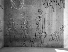 En los años cuarenta, personaliza los muelles marítimos de Lisboa (de Alcântara y de Rocha do Conde de Óbidos) con paneles de frescos impregnados de un imaginario de referencias populares y de temáticas sociales. En Alcântara, en el mural titulado “Quien no ha visto Lisboa, no ha visto nada bueno”, Almada Negreiros representa algunas de las actividades del puerto de Lisboa, captando el trabajo de tres mujeres mientras descargan carbón y otras tres mientras venden pescado. Como contrapunto a esta actividad, la ciudad al fondo está totalmente vacía de actores o de movimiento, salvo “un tranvía que pasa, como un fantasma silencioso que vive dentro del vacío mortal que lo observa”,9 según la lectura que José- Augusto França hace sobre este trabajo.