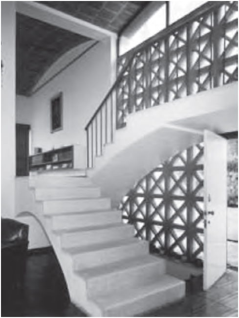 Fue entonces cuando hicimos varias casas, entre esas la mía, localizada en los cerros orientales de Bogotá cerca del colegio Nueva Granada, la cual fue demolida. En esa casa ensayamos, yo creo que, por primera vez en Colombia, la construcción moderna de bóvedas de empuje en ladrillo, como todas las catalanas que tienen todas las construcciones en Cartagena. El diseño contemplaba tres bóvedas y en su interior tenía una escalera muy esbelta hecha en tabletas de ladrillo de empuje. Probablemente la casa no era muy práctica, pero era muy bonita volumétricamente.4