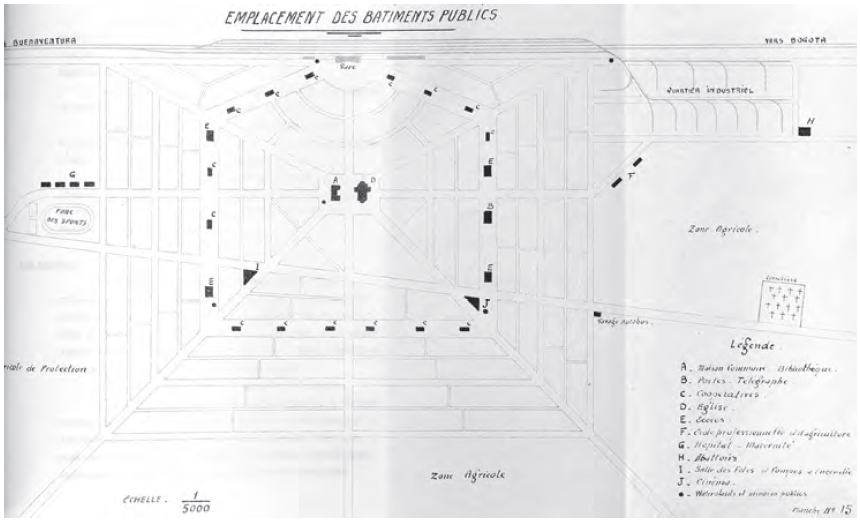 En dirección hacia Cali se preveía también un área destinada a futuros talleres de la Pacific Railway Cie. —estos también jamás construidos— y la Cité Industrielle, que estaba inscrita en una zona de protección conformada por un rectángulo de 1950 metros por 3850 metros (véase fig. 11). Los planos que ilustran el proyecto de Severo Reyes acompañan aquellos capítulos en los cuales se desarrolla algún aspecto puntual del proyecto: la inserción en el territorio, el trazado vial, los sistemas de transporte, las zonas de arborización, el espacio público, los equipamientos y edificios públicos (fig. 12), la zona de protección periférica, la división predial, las redes de servicios (agua, alcantarillado, iluminación, etc.), e incluso las áreas y tipos de vivienda (fig. 13).