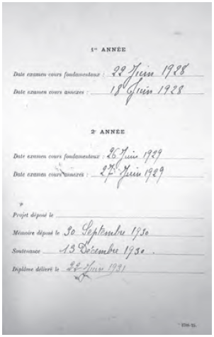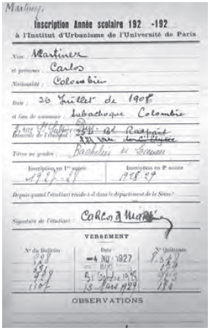 La primera tesis de un estudiante colombiano en ser defendida con éxito fue la de Carlos Martínez, titulada Contribution à une étude d’urbanisation de Bogota (fig. 4), bajo la dirección del profesor Marcel Poëte. En el registro de inscripción del estudiante se indica que su tesis fue entregada el 30 de septiembre de 1930 y defendida el 13 de diciembre del mismo año, con lo cual recibió su diploma el 22 de junio del año siguiente (figs. 5 y 6).