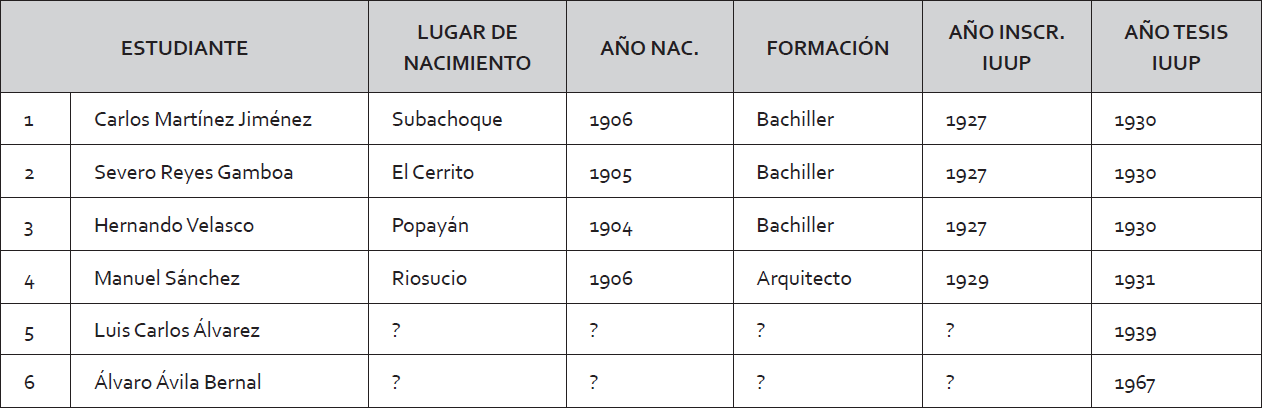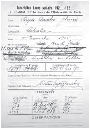 De un total de seis colombianos21, cuyas tesis fueron defendidas entre 1930 y 1967, y que reposan en la Bibliothèque Historique Poëte et Sellier (tabla 2), encontramos que tres de ellos, Carlos Martínez, Severo Reyes y Hernando Velasco (fig. 2), se inscribieron en un mismo lapso, al finalizar 1927, y defendieron igualmente sus respectivas tesis al finalizar 1930. Al igual que Manuel Sánchez (fig. 3), el cuarto colombiano que arribó dos años después, en 1929, todos ellos tenían en común un mismo promedio de edad al ingresar al IUUP: entre 21 y 23 años. Originarios de diferentes regiones de Colombia —Carlos Martínez, del centro del país cerca de la capital; Severo Reyes y Hernando Velasco, del suroccidente, cerca del Océano Pacífico; y Manuel Sánchez, del occidente del país de una región cafetera—, la información personal de los tres estudiantes que aparece consignada en sus registros de inscripción precisa que todos tenían algún tipo de formación universitaria de primer ciclo — en los registros, Carlos Martínez y Hernando Velasco figuran además como bachelier ès sciences, y Severo Reyes como bachelier ès lettres—; pero sin mayores precisiones sobre la disciplina conocida por cada uno de ellos. Solamente Manuel Sánchez aparece registrado con una formación previa como arquitecto —y entre paréntesis: “Maestro École N.” —. La información sobre Álvarez, quien seguramente ingresó en 1936, y sobre Alvaro Ávila, quien debió haberlo hecho en 1964, no está disponible, por cuanto los registros de inscripción no se encuentran en el archivo citado.