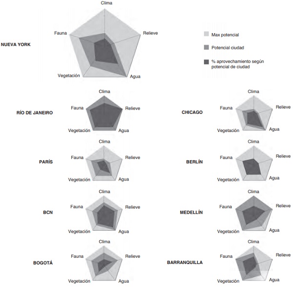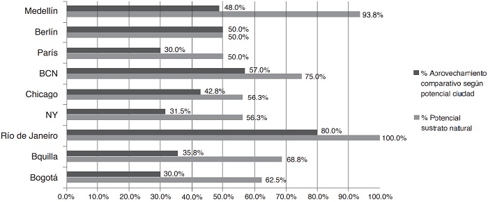 La fig. 3 presenta los resultados consolidados del potencial del sustrato natural para cada ciudad.[27] En este se aprecia que Río de Janeiro, Medellín y Barcelona se destacan por su alto potencial; mientras que Berlín y París son calificadas con potencial bajo.