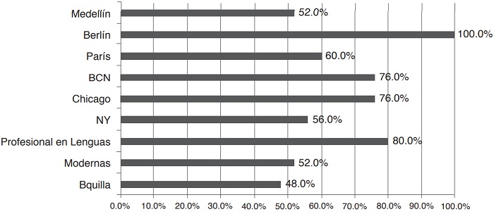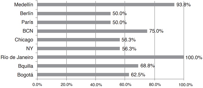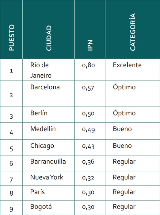 Río de Janeiro se destaca sobre las demás ciudades con un índice de 0,80 (aunque no alcanza el máximo puntaje, 1); 23 puntos por debajo se encuentra Barcelona, que tiene un índice de 0,57. Bogotá, Nueva York y París tienen el nivel más bajo, con un valor alrededor de los 0,30 y 0,32. Mientras que Medellín está en una posición media, con un índice de 0,49.