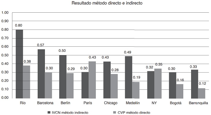 La tabla 2 presenta los resultados del método directo en las nueve ciudades evaluadas.