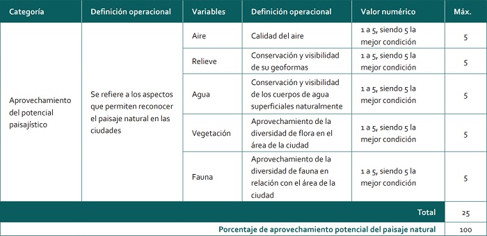 Para el caso de esta investigación, se trabajó desde el enfoque de la percepción, teniendo como principales variables el potencial paisajístico y la calidad (visual) del paisaje, en un sistema de análisis mixto con valoración directa de subjetividad representativa y análisis posterior indirecto comparativo y subjetivo del potencial y aprovechamiento de la naturaleza en las ciudades:[20]