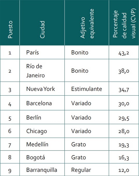 París recibe el mayor puntaje, con un 43,2 % en su calidad visual del paisaje; seguida por Río de Janeiro y Nueva York, con 38 % y 34,7 %, respectivamente. Las tres ciudades colombianas ocupan los últimos puestos, obteniendo Barranquilla el más bajo porcentaje (12 %). Es de destacar que ninguna de las ciudades evaluadas supera el 50 % en la evaluación de la calidad visual del paisaje, lo cual resulta significativo respecto a las expectativas de los observadores sobre el paisaje urbano. Se propone, en el futuro, aplicar el análisis a paisajes naturales y verificar si en estos casos se logra superar el 50 % en la evaluación colectiva de la calidad visual.