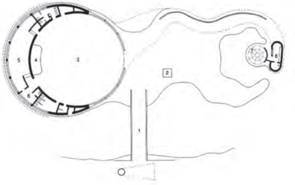 Tres elementos concadenados definen entonces el proyecto: el cilindro, la pérgola sinusoidal y el volumen ovoidal del pequeño vestuario. Estos elementos se fusionan para generar un organismo unitario y orgánico, inusual en la arquitectura del Movimiento Moderno.