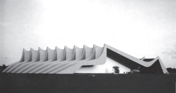 El interesante proyecto no realizado para el Auditorio del Ministerio de Educación y Salud de Río de Janeiro (de la mitad de los años cuarenta) es el primer ensayo de este tipo. El ejemplo más claro y contundente es la Catedral de Brasilia (del final de los años cincuenta). En ambos casos, la repetición pautada de la estructura principal sigue un eje curvo; el primero se presenta en planta como un abanico; el segundo, como un círculo.