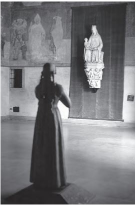 La cuestión de la historia aflora inmediatamente en el campo de la restauración y, especialmente, en el museo, donde se hacen evidentes las interferencias entre memoria y actualidad, historia y presente, lo cual obliga a una posición conscientemente cultural. En 1949, Giulio Carlo Argan se declaraba contra el coleccionismo en favor de un “museo attivo”, pues solo con el estudio y la educación a través del arte y su historia se puede pasar al momento de su producción.15 Este fue un punto de partida para su proyecto del Museo del Castello Sforcesco de Milán: un museo didáctico obtenido mediante la manipulación de repertorios, imágenes plásticas o formas históricas, alusivas o literarias, para alcanzar una mayor capacidad expresiva. Esta ansia comunicativa se debía conseguir con una mayor resonancia entre obra de arte y la cavidad expositiva: objetos artísticos, montaje museográfico y edificio no podían considerarse separadamente. La Vergine orante, en la capilla Ducale, rezando como una persona viva, o el nicho y gradas en torno a la Pietà Rondanini, así como el diseño de soportes, peanas, vitrinas o luminarias, son claros ejemplos de la reconstrucción de fragmentos de historia, donde se pone en relación una “memoria privada” (la de los intelectuales) con una memoria colectiva y popular.