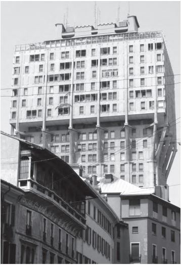 En la Torre Velasca (1956-1958) se concentran todas estas cuestiones: la tradición, las preexistencias ambientales y la memoria histórica. En la presentación del edificio en Casabella-continuità explicaban los dos momentos en los que concibe el proyecto. El primero se correspondía con la elección tipológica (la torre) y volumétrica (cuerpo de base, fuste y capitel) que obedecían a la “objetividad técnica de los problemas” como son funciones (oficinas y viviendas), estructura y “la objetividad histórica (el ambiente) donde se inserta la obra nueva”. El segundo respondía a la pérdida de estos datos tecnológicos o funcionales como apoyo al diseño, para quedar las fachadas como laboratorio de expresión lingüística en las cuales encontrar un lenguaje alternativo al Estilo Internacional, inteligible para el público, susceptible de comunicar una historia y recoger “la atmósfera de la ciudad de Milán, su inefable y, sin embargo, perceptible característica”.16