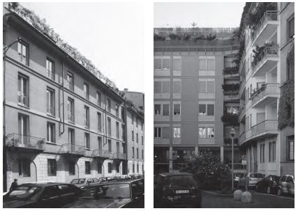 Entre 1948 y 1960, el grupo BBPR12 ejemplifica sus teorías en una serie de obras en el centro de Milán. En las viviendas y oficinas en Piazza San Erasmo-via Borgonuovo (1946-1948) se encontraron con un fragmento de edificio derruido por los bombardeos en el límite de la ciudad neoclásica. Sobre la calle Borgonuovo restauraron parte del palacio destruido y construyen un nuevo cuerpo, siguiendo las cadencias de huecos verticales propias de la Milán neoclásica. Una cesura vertical distingue lo viejo del nuevo lienzo de fachada que, sin mimetismos, celebra el ritmo unitario de la calle. En Piazza San Erasmo, recayente a la ciudad moderna, presentan la estructura vista, entrepaños estucados y paneles-ventana prefabricados, pero aun así, se asumen ciertos matices y claroscuros que otorgan una “tonalidad” urbana. Hay una continuidad esencial en la historia que permite recomponer, yuxtaponer y recrear nuevo y antiguo, según una tradición no interrumpida a lo largo de la historia.