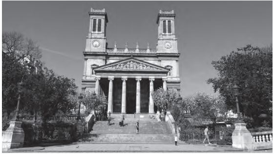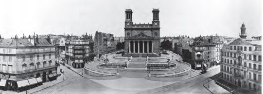El combate librado por Hittorff en torno al tema de la policromía iba estrechamente ligado a su producción como arquitecto. El frontispicio de L’architecture polychrome chez les Grecs,13 en el cual retomó veinte años más tarde la misma cuestión, resume su demostración con la simple yuxtaposición de tres templos: el egipcio, el griego y el romano, todos ellos enriquecidos por decorados coloridos. Valiéndose así de los antiguos para dejar atrás la tradición monumental francesa en torno al uso del sillar monocromo, Hittorff cerraba su recopilación de láminas con dos de sus principales realizaciones en París: la fachada de la Iglesia de Saint-Vincent-de-Paul y el Cirque d’hiver.