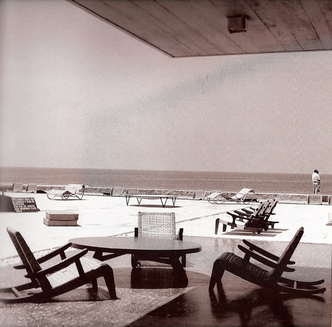 Porset’s interior spaces contest traditional notions of inside and outside, and transgress boundaries between the public and the private sphere. These constructed spaces for leisure and appearance-as Hannah Arendt might designate them-represent a stable, sophisticated, and seductive Mexico for export. An example may be the Hotel Pierre Marqués in Acapulco (fig. 1), where Barragán designed the landscape. Porset’s outdoor furniture, structured from continuous steel tube and clad in woven wicker, brought a casual elegance and a sensual inhabitability to the spaces designed for social gatherings.