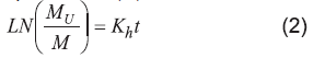 Donde LN es el logaritmo natural; t tiempo (d), MU es la producción de metano al final de experimento (molL-1); M es la producción remanente en el tiempo (M=Mu-M(t)) y Kh es la constate de tiempo de hidrólisis (d-1).