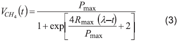 Donde VCH4(t) es la producción de metano en el tiempo (mLCH4h-1), Pmax es la máxima producción de metano (mLCH4), Rmáx la tasa máxima producción de metano (mLCH4h-1) y λ es la fase de latencia (h). La validación tanto del modelo cinético de primer orden como del ajuste de función logística, se hizo a partir del coeficiente de determinación (R2) y el cuadrado medio del error (CME) solamente para la función logística. El ajuste de los modelos matemáticos empleados se realizó usando la herramienta Excel del paquete Office 2007.