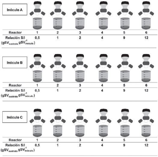 Para obtener diferentes valores de la relación S/I en términos de gSVsustratogSV-1 inóculo, en todas las unidades experimentales se mantuvo fija la concentración del inóculo, la cual correspondió a 1,5gSVinóculoL-1, valor recomendado para ensayos PBM sin agitación continua [15]. La concentración del sustrato fue modificada en términos de gSVsustrato en cada unidad experimental. La Figura 1 muestra el esquema de las relaciones que se evaluaron. Cada una unidad experimental contó con su respectivo duplicado (n=2) y con un control (inóculo más agua destilada) para realizar la corrección por el metano endógeno.
